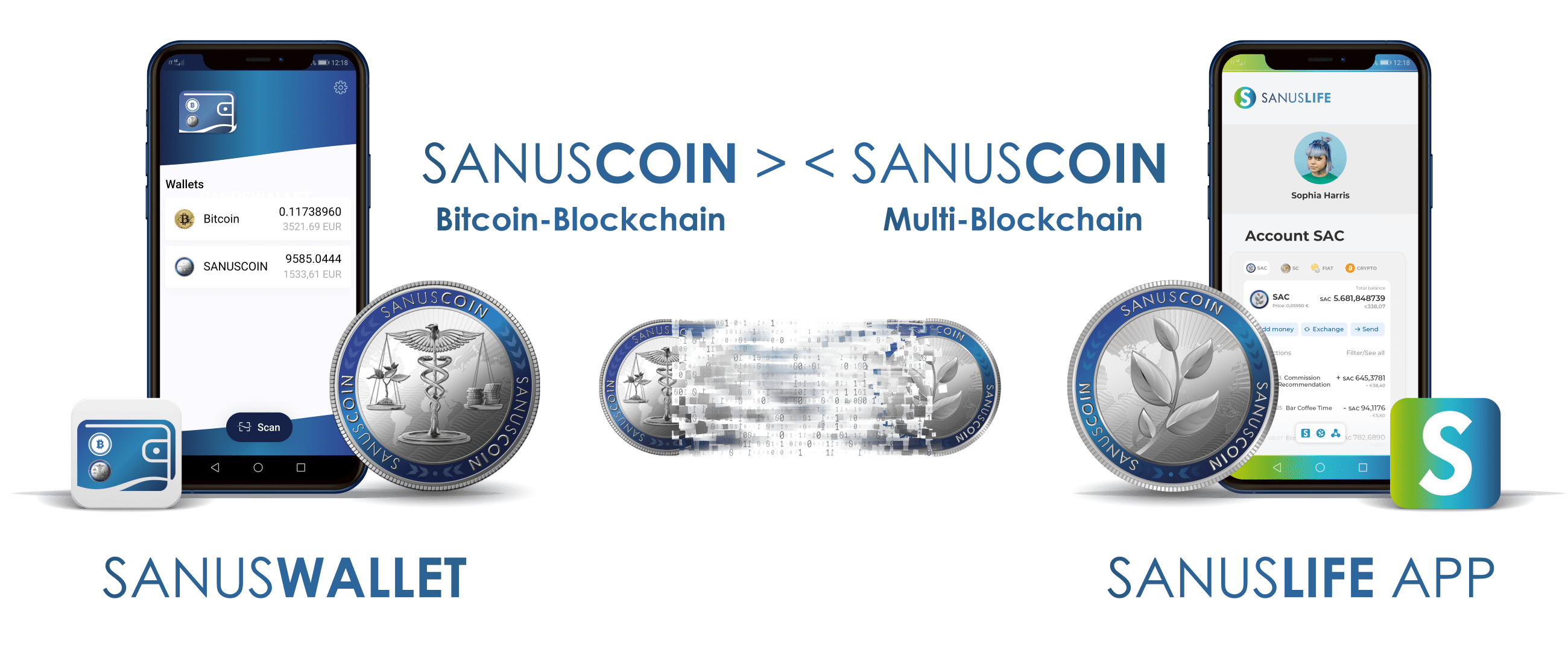 Auf der Bitcoin-Blockchain sind die SANUSCOINS zusammen mit den Bitcoins dezentral gespeichert. Über das SANUSWALLET können die Coins verwaltet und transferiert werden.